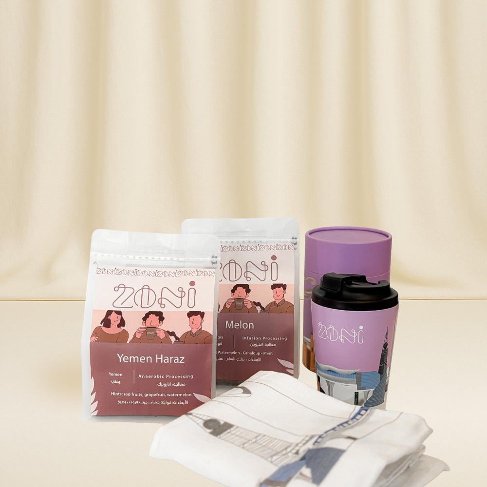 باكج قهوة فاخرة من ZONI يضم قهوتين فاخرتين بنكهات Yemen Haraz وMelon، كوبا حراريا أنيقا بلون بنفسجي وشنطة قماش توت باج عملية باكج متكامل مع بوكس التميز للقهوة.