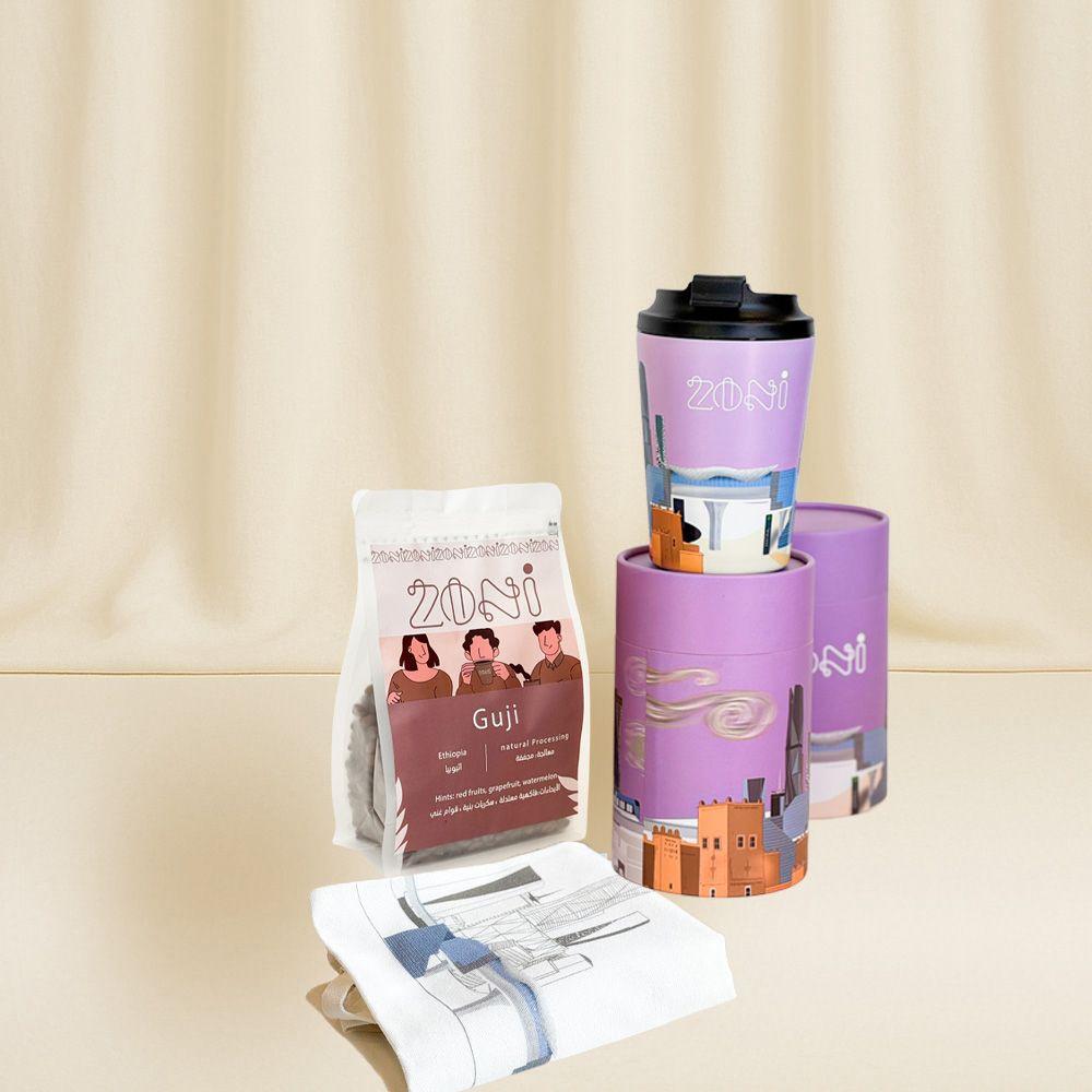 بوكس قهوة من ZONI يجمع كل ما تحتاجه هدية لمحبي القهوة في باكج واحد, يحتوي على قهوة إثيوبية فاخرة، كوب حراري أنيق، وحقيبة قماشية عملية.
